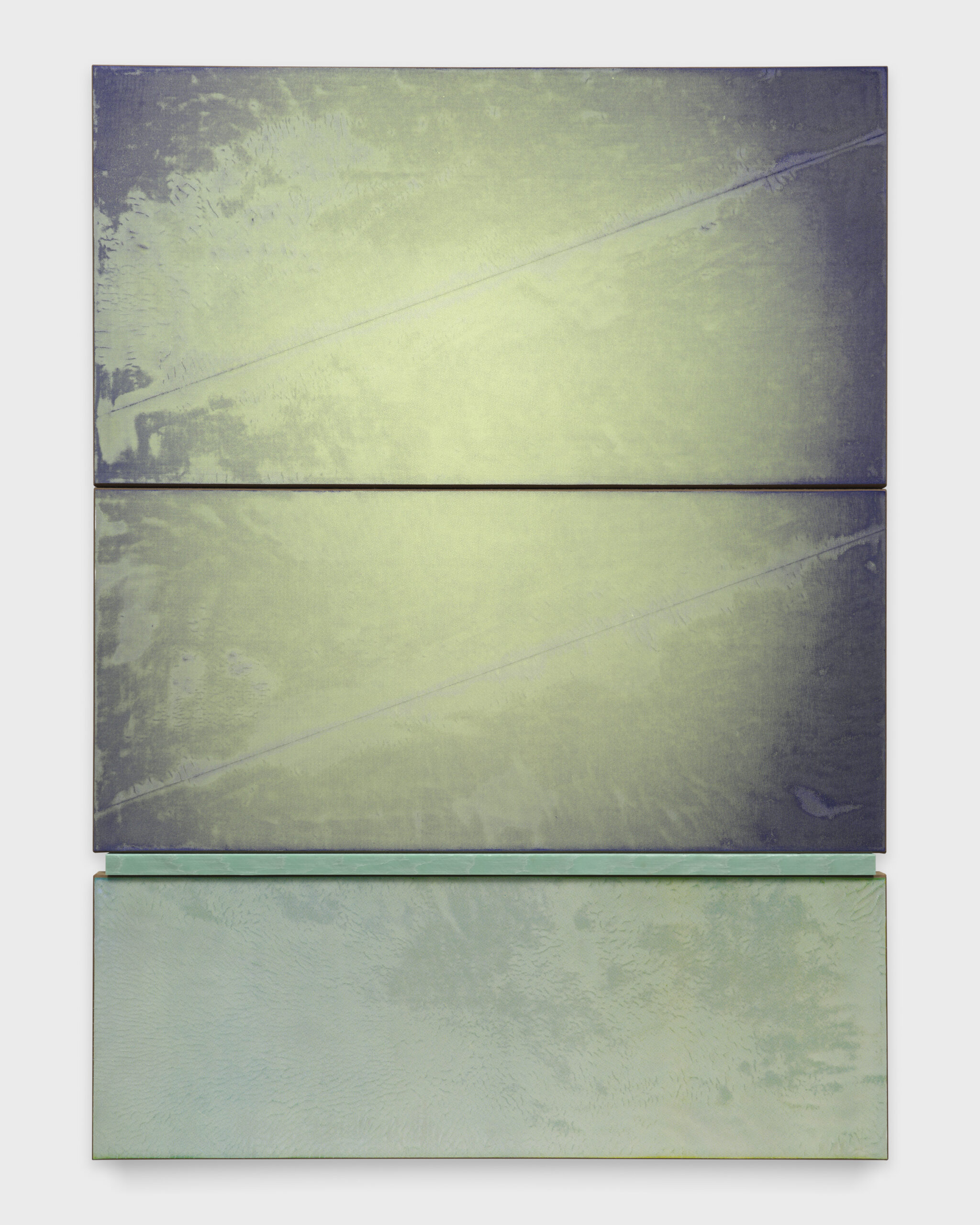 I bordi smussati delle opere rivelano i loro substrati terrosi, permettendo loro di “respirare”. In questi margini scolpiti, i strati di terra, gesso e iuta sono resi visibili, esponendo la struttura quasi geologica di ogni pannello. Questa strategia appare diversamente in una serie di lavori in cui corde sono incorporate o scavate dai suoli terrosi, quest’ultimi creando sottili trincee di spazio negativo, dove la materialità dell’opera è esposta e grezza. Preoccupazioni ecologiche percorrono queste pitture con riferimenti all’interconnessione e intervento umano e non umano. Esaminano, su una scala intima, l’impatto del tatto sulle risorse naturali e riflettono sul modo in cui i materiali sintetici contengono, modellano e si fondono con l’ambiente. Qui, Photoshop può imitare un campo di fiori con un motivo di stampa algoritmico, ma una rosetta rimane ancora un campo di uni e zeri. Queste questioni di mimesi, artificialità e sfruttamento sono in gioco in queste pitture, ma in modo sottile. Attraverso le opere in mostra, la natura e i sottoprodotti della fabbricazione sono contrapposti su palcoscenici verticali di terra, elevando questo materiale fondamentale e fonte.